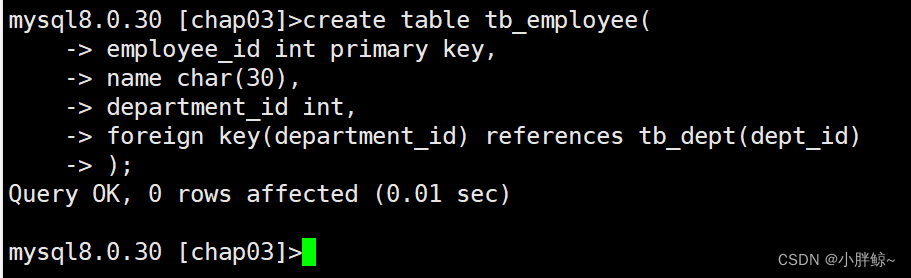 (2)创建表tb_employee,外键key (department_id)参考表tb_dept的主键dept_id