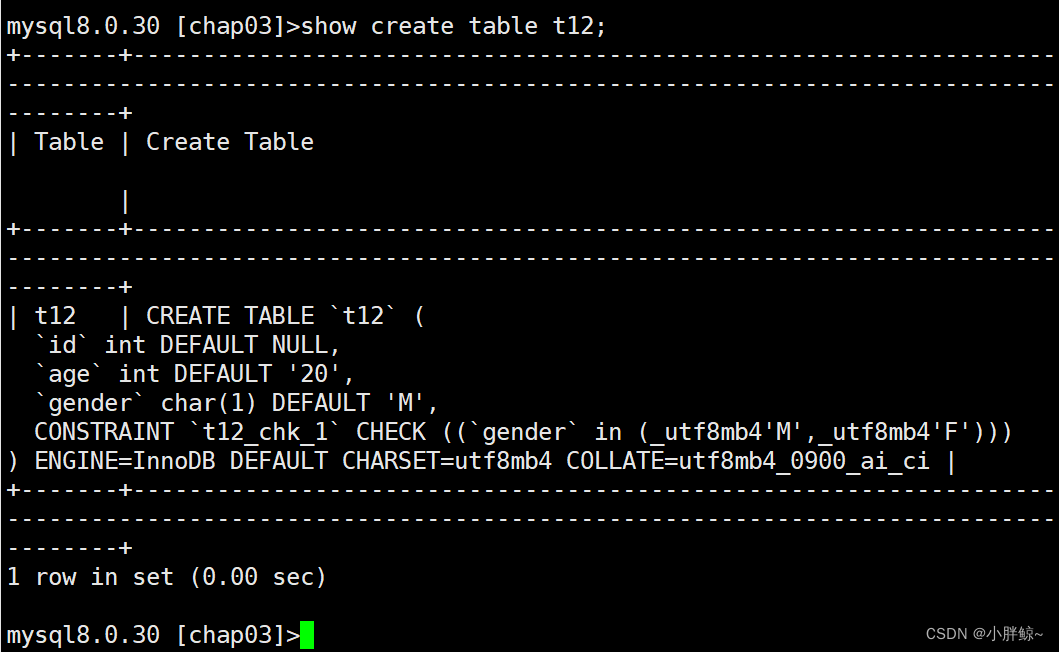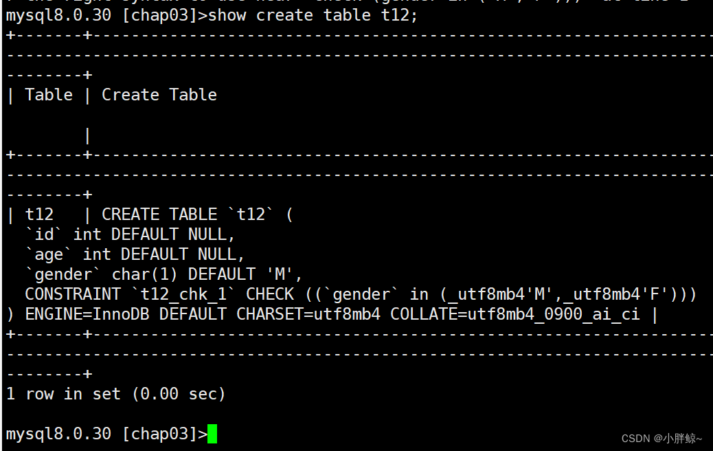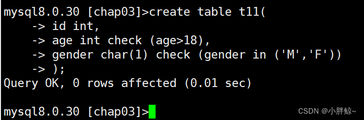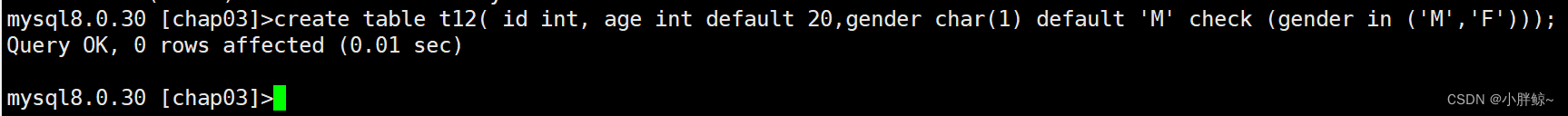 mysql8.0.30 [chap03]>create table t12( id int, age int default 20,gender char(1) default 'M' check (gender in ('M','F')));