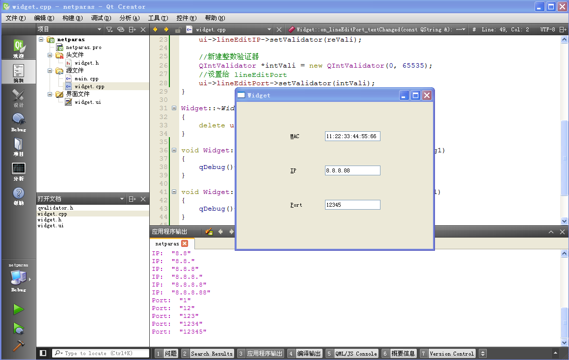 widget.cpp 文件接下来是三个槽函数的内容,我们编写打印调试输出的代码即可: