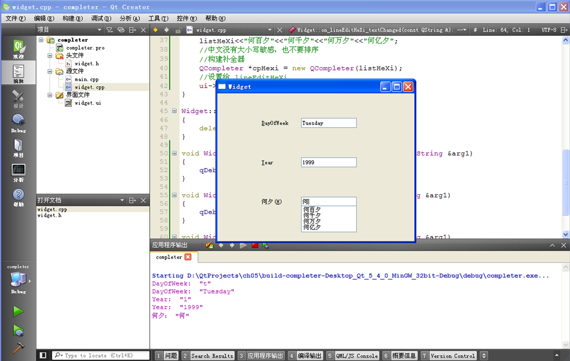直接根据 listHeXi 构建补全器 cpHexi ,然后把补全器设置给 ui->lineEditHeXi,这样构造函数代码就完整了。