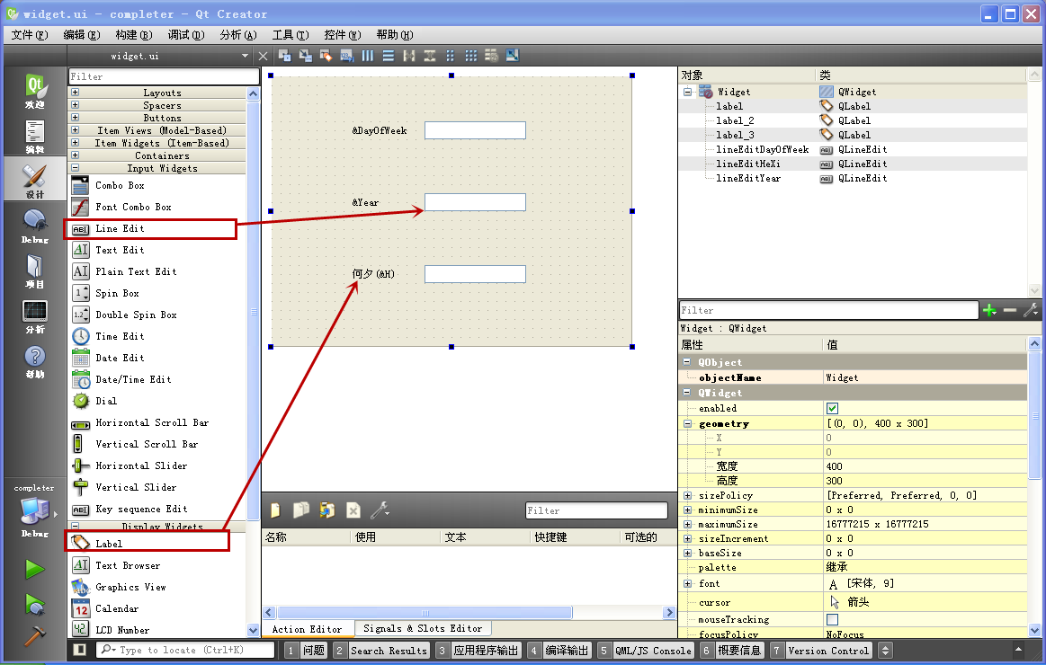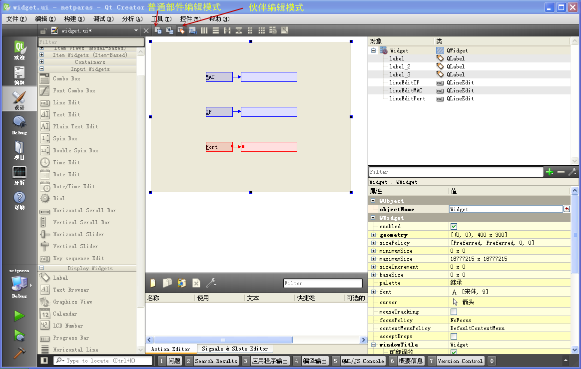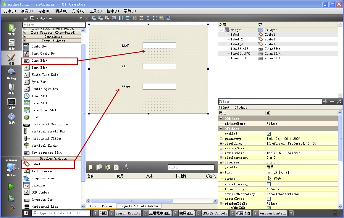 建好项目之后,打开窗体 widget.ui 文件,进入设计模式,按照下图拖入控件: