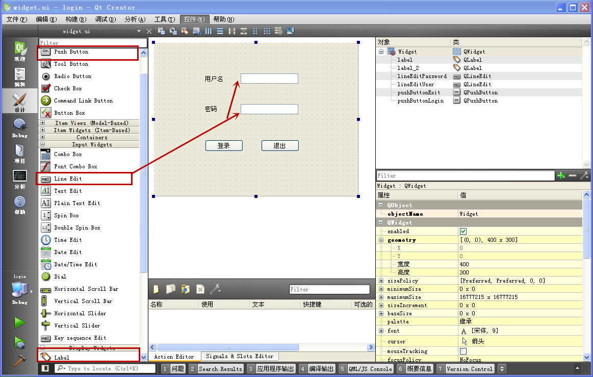 两个单行编辑控件,上面的 objectName 设为 lineEditUser,下面的 objectName 设为 lineEditPassword,并尽量与两个标签控件对齐。