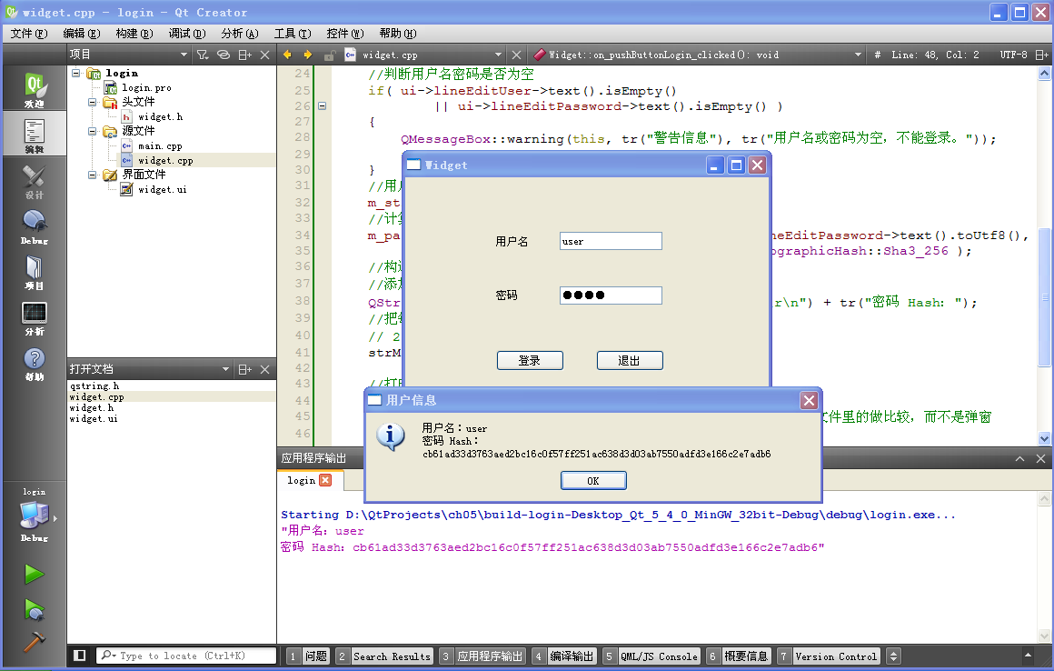 两个槽函数是刚才从图形界面添加的,这里新增了两个成员变量 m_strUser 保存用户名,m_passwordHash 保存密码的 Hash 值。头文件内容就这些,下面来编辑 widget.cpp ,首先添加头文件包含和构造函数里的代码: