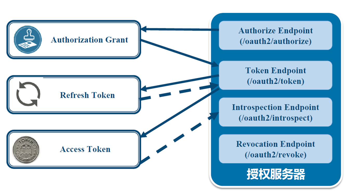 授权认证中心主要提供四个端点:认证端点、令牌颁发端点、令牌校验端点和注销端点。