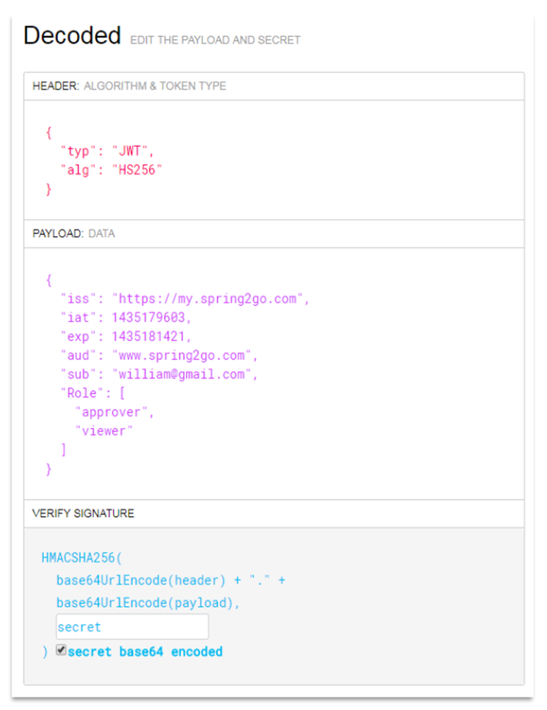 首先,需要指定一个密钥(secret)。这个密钥只有服务器才知道,不能泄露给用户。然后,使用 Header 里面指定的签名算法(默认是 HMAC SHA256),按照下面的公式产生签名。