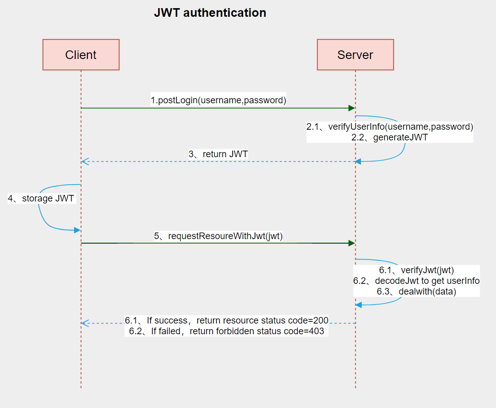 其实 JWT 的认证流程与 Token 的认证流程差不多,只是不需要再单独去查询数据库查找用户用户;简要概括如下: