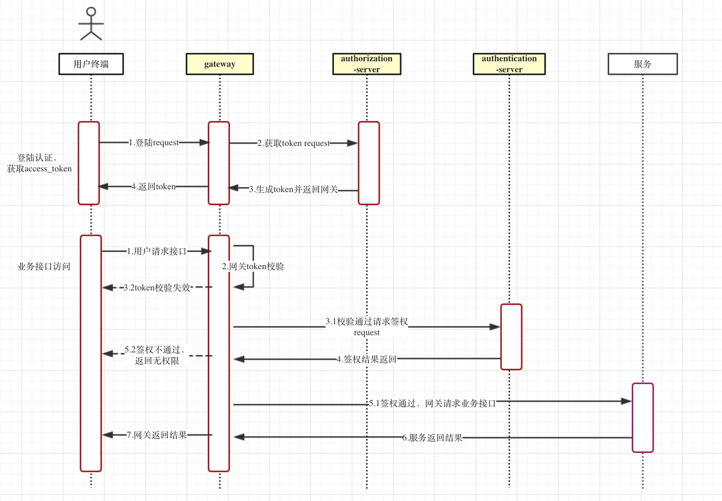 经过微服务SpringCloud体系升级改造,统一认证中心集成了gateway,授权服务authorization,鉴权服务authentication,其时序图如下所示: