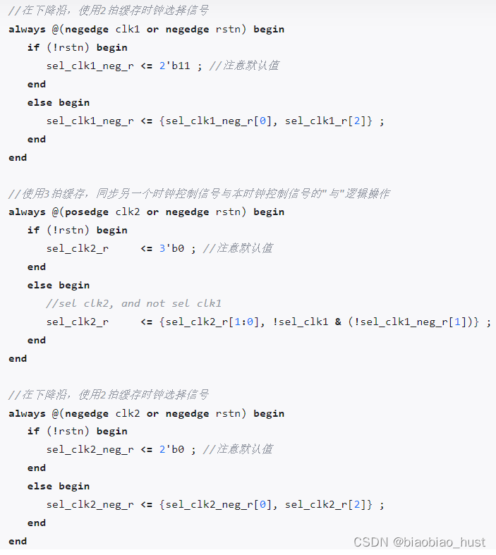 该电路利用时钟下降沿对时钟选择信号 sel_clk 进行缓存。同时一个时钟选择信号对另一个时钟进行反馈控制,保证同一时刻只能有一路时钟有效。最后采用"或操作"将两路时钟合并,完成时钟切换的过程。