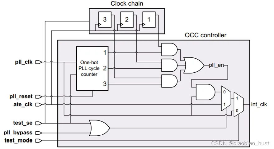 片上时钟控制器(On-chip Clock Controllers ,OCC),也称为扫描时钟控制器(Scan Clock Controllers,SCC)。OCC 是插在SoC上的逻辑电路。用来做DFT测试,基本原理是在 scan shift 模式下, 选通慢速的ATE 时钟,load 或 unload 扫描链; 在 capture 模式下,对 free-running PLL clock 过滤筛选出 lauch 和 capture clock 进行at-speed 测试。在ATE(自动测试设备)上对芯片做ATPG测试时,OCC用于控制内部scan flip-flop时钟。