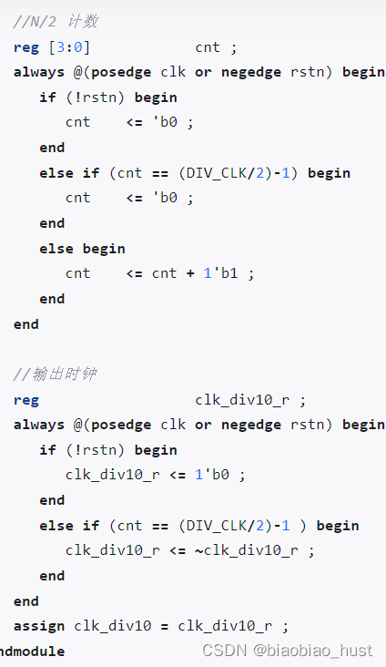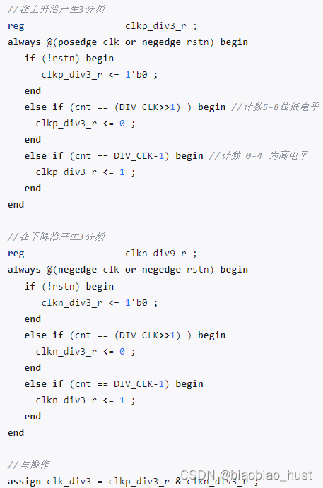两个 3 分频时钟应该在计数器相同数值、不同边沿下产生,相位差为半个时钟周期。然后将 2 个时钟进行"或操作",便可以得到占空比为 50% 的 3 分频时钟。以3分频为例,对应的代码如下: