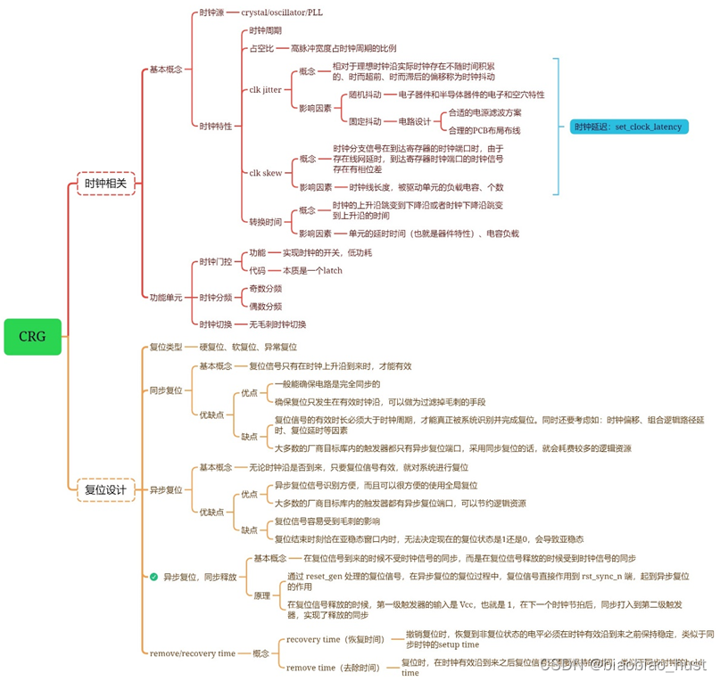 涉及到的主要技术:自动解复位,复位顺序,复位切频,时钟门控,亚稳态的恢复,异步复位同步释放,毛刺清除的技术细节。不用公司,不同芯片,因为场景不同,对于CRG的要求也不尽相同,但是具体的技术原理大同小异。CRG中主要包含这些东西: