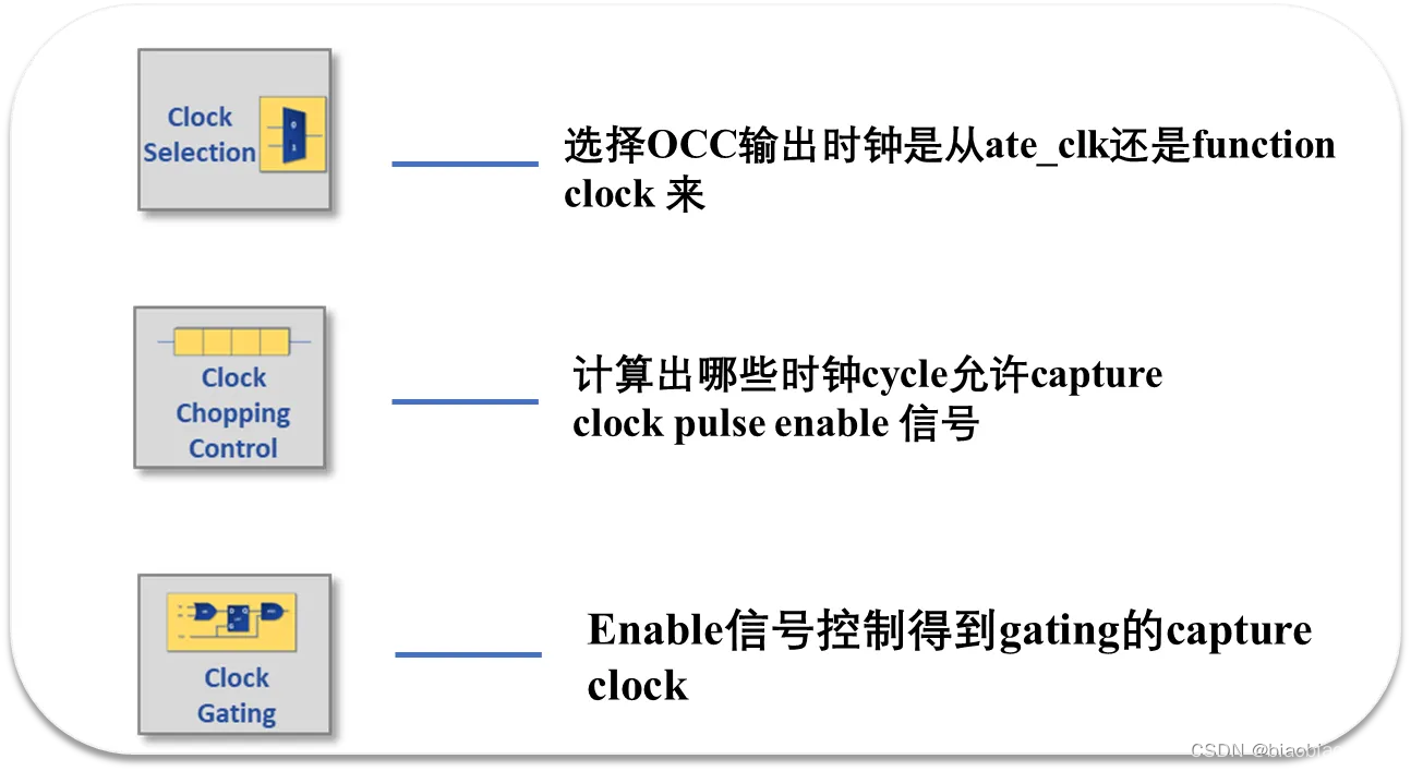 片上时钟控制器(On-chip Clock Controllers ,OCC),也称为扫描时钟控制器(Scan Clock Controllers,SCC)。OCC 是插在SoC上的逻辑电路。用来做DFT测试,基本原理是在 scan shift 模式下, 选通慢速的ATE 时钟,load 或 unload 扫描链;在 capture 模式下,对 free-running PLL clock 过滤筛