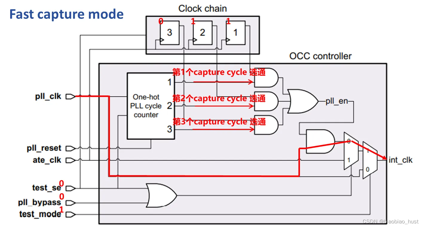 当OCC处于fast capture mode时,期望在capture阶段生成两个function clock脉冲。所以test mode = 1,scan_en = 0,pll_bypass = 0,此时pll _clk选通,并且PLL cycle counter 和clock chain的输出经过ICG共同决定gating几个时钟脉冲,完成at-speed测试。