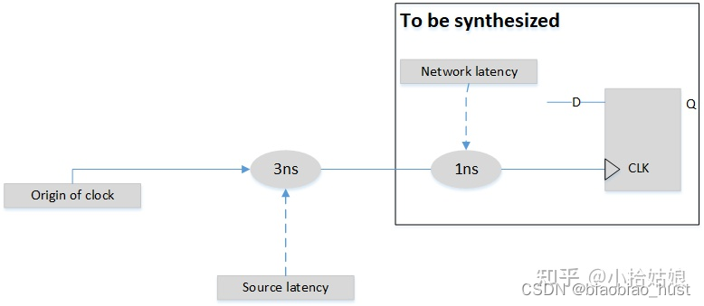 时钟网络的延迟( clock network latency)是时钟信号从其定义的点(端口或引脚)到寄存器时钟引脚的传输,经过缓冲器和连线产生的延迟(latency),上图是1ns。