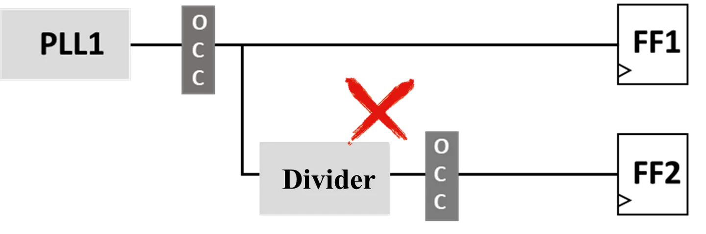 以多个插入DFT的OCC为例,可以看到下图是一个错误插入方法,原因是驱动divider的clock已经被OCC执行过chopping的动作,不再是free-runing的clock,这样就无法得到期待的clock。