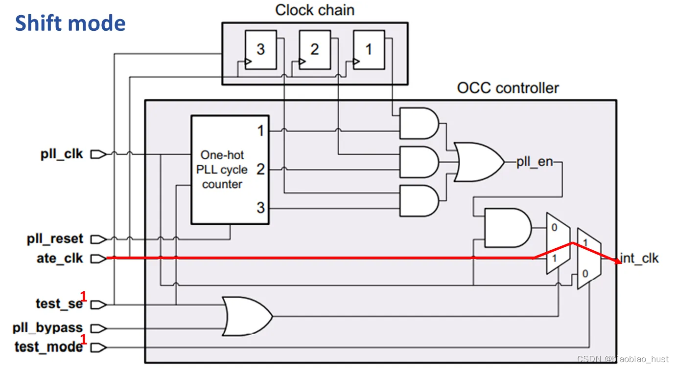 当OCC处于shift mode时,我们在ate clock的控制下将测试向量load进internal scan chain和clock chain内,所以test mode = 1,scan_en = 1,此时ate _clk选通,完成shift操作。