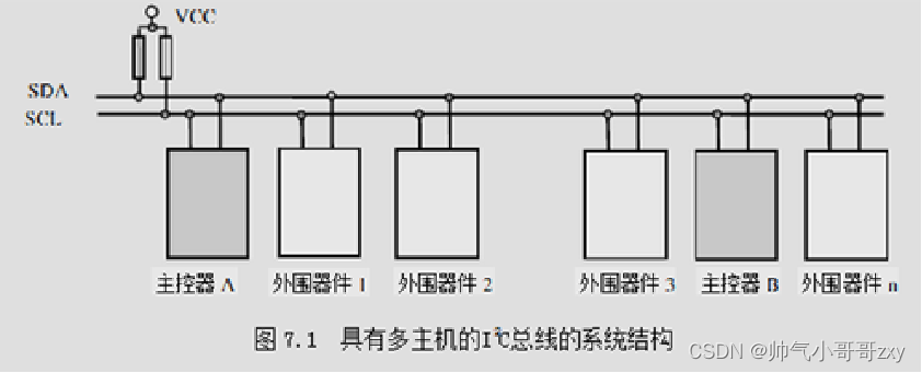 它是由数据线SDA和时钟SCL构成的串行总线,可发送和接收数据。