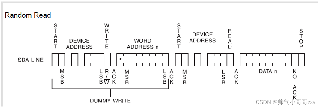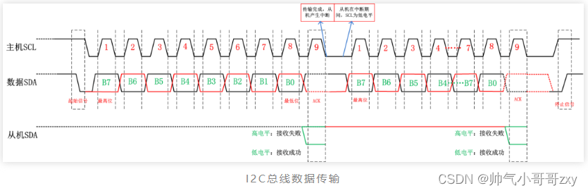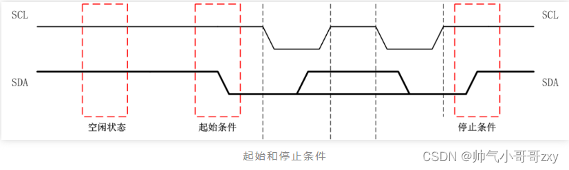 起始条件:SCL为高电平时,SDA由高电平向低电平切换;表示开始传送数据。