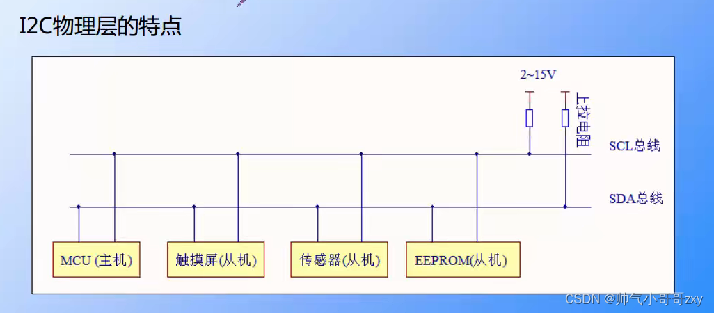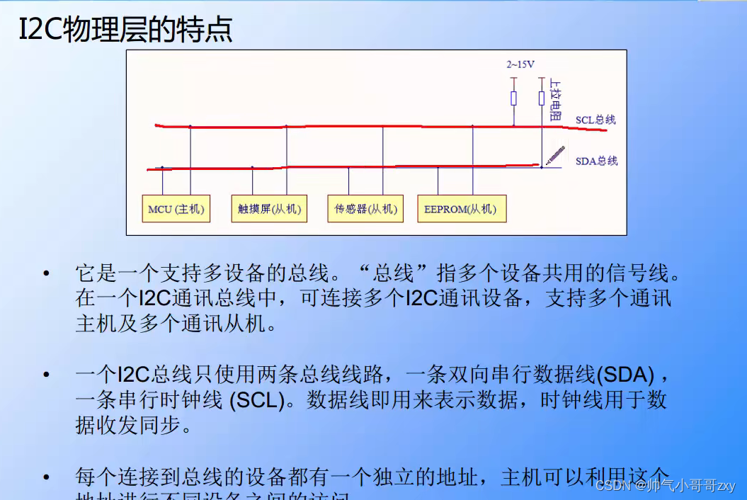 1、 只要求两条总线线路: 一条串行数据线SDA(因此是半双工的), 一条串行时钟线SCL;