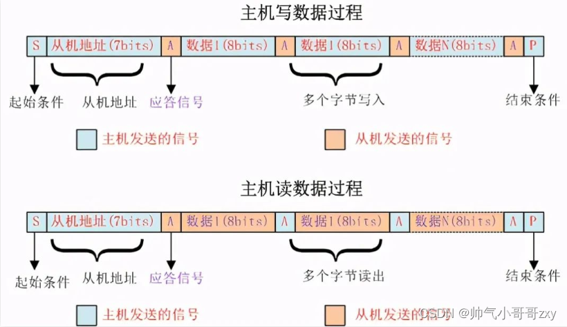 结束信号:SCL 为高电平时,SDA 由低电平向高电平跳变,结束传送数据。