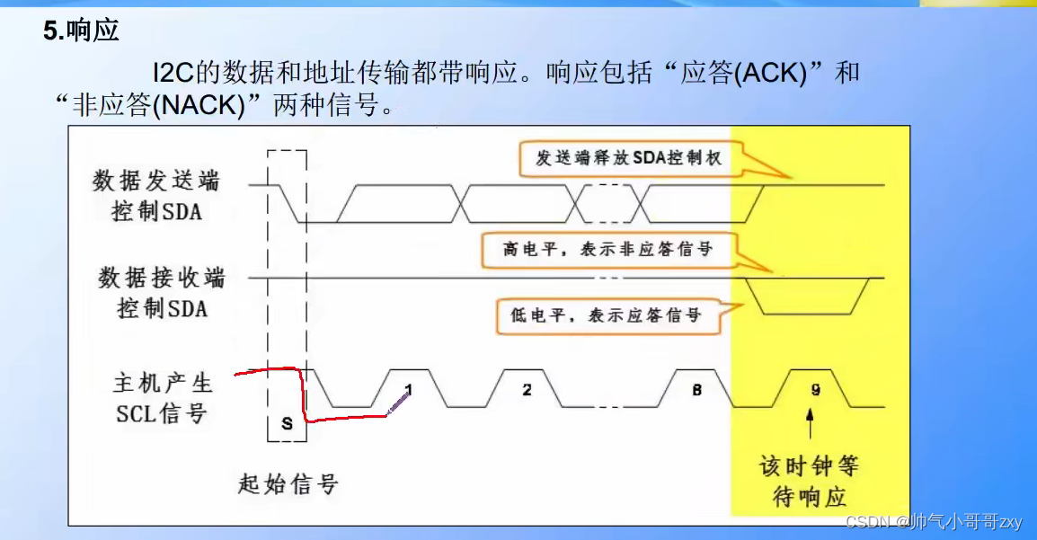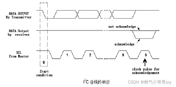 1.发送器每发送一个字节,就在时钟脉冲9期间释放数据线,由接收器反馈一个应答信号。