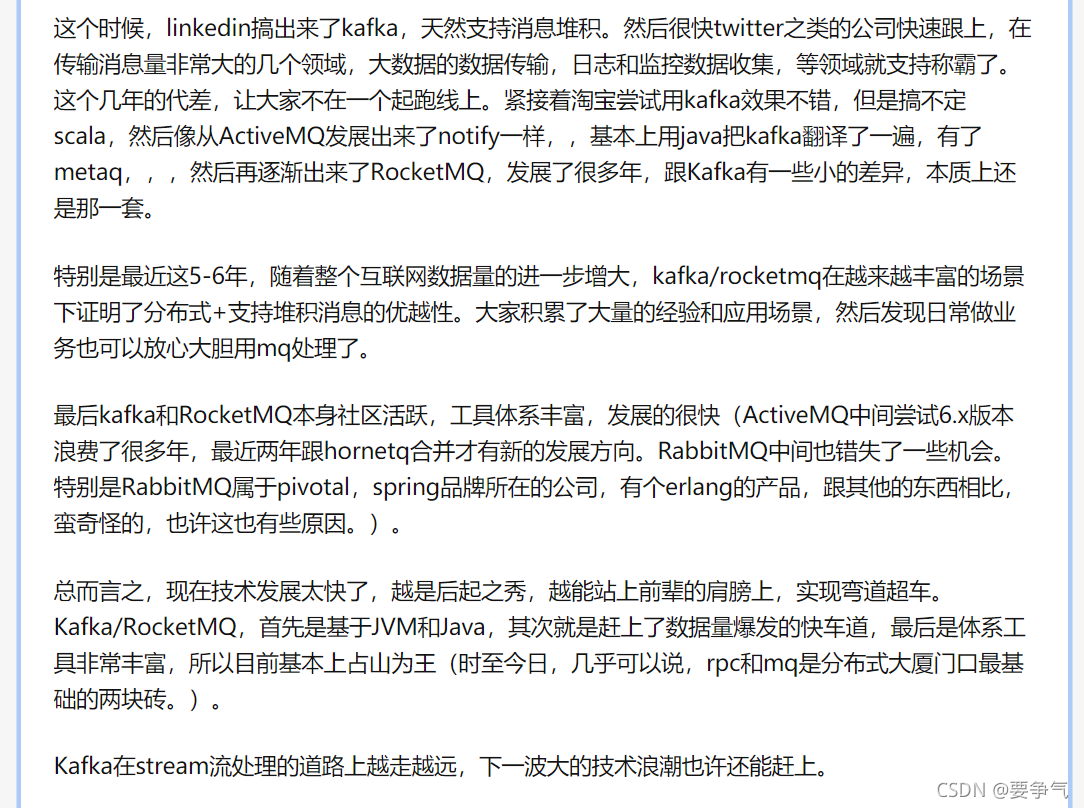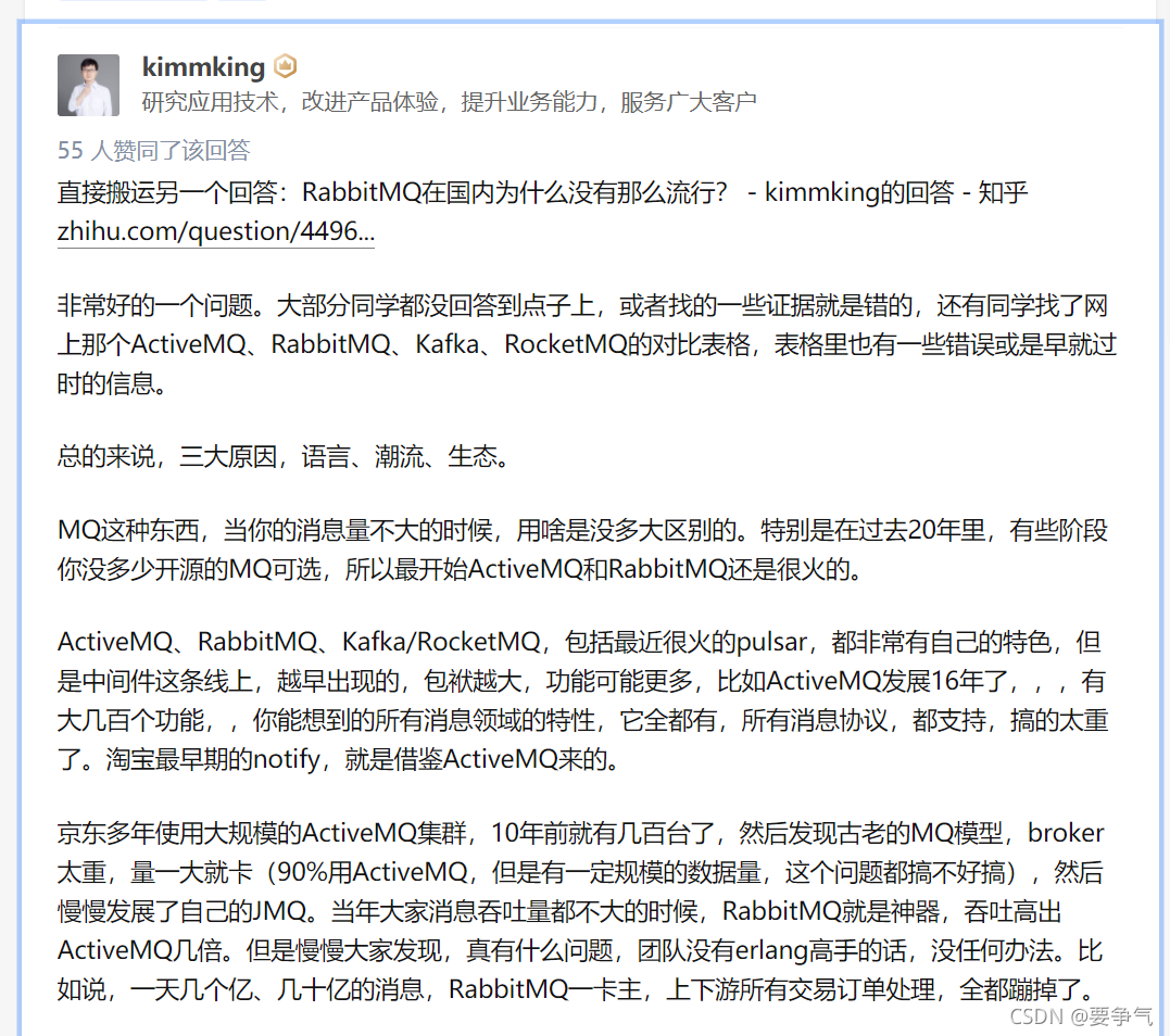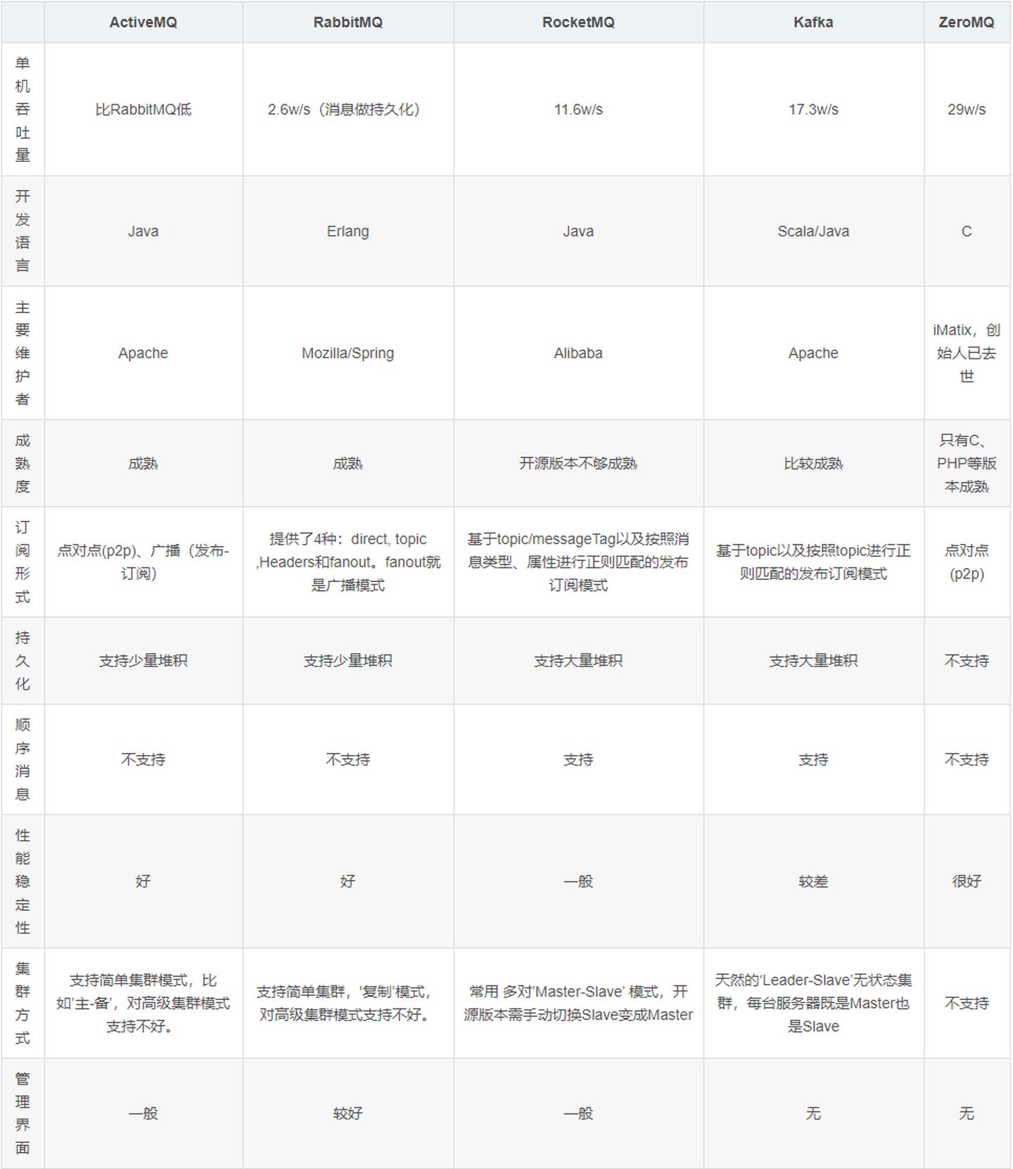 本文只做了Kafka和RabbitMQ的对比,但是开源队列岂止这两个,ZeroMQ,RocketMQ,JMQ等等,时间有限也就没有细看,故不在本文比较范围之内。