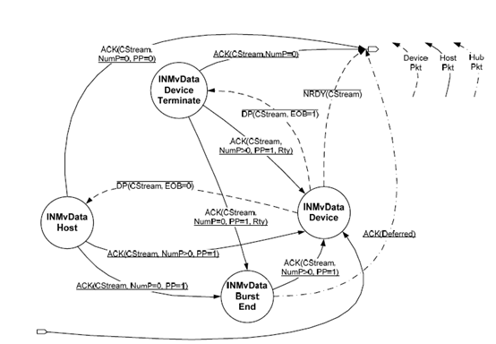ACK(CStream, NumP>0, PP=1, Rty) –如果设备接收到Rty = 1的ACK TP,则应该转换进入INMvData Device状态,并重发恰当的包(resend the appropriate DP)。这是主机在检测到从设备来的DP中有错误,而突发尚未完成时的主机响应。