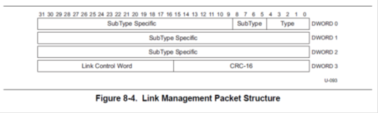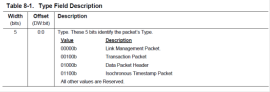 所有的超高速头包都是以Type字段开始的,用以判定如何解释该包。在高层次上这告诉包的接收者如何处理它:要么使用它来管理链路,要么用来控制设备和主机之间的数据流。