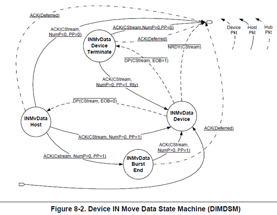 Device IN Move Data State Machine (DIMDSM)是从上面描述的Start Stream或Idle状态进入的。一旦进入DIMDSM,立即就转换进入INMvData Device状态。DIMDSM允许设备由于耗尽与Stream相关的Function Data而终结Move Data操作,也允许主机因耗尽与Stream相关的Endpoint Buffer空间而终结Move Data操作。