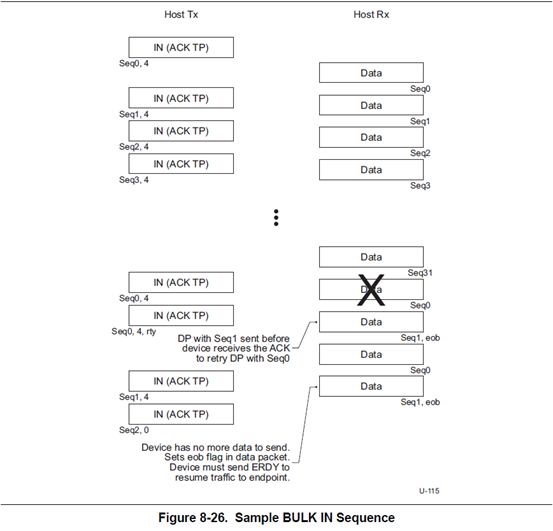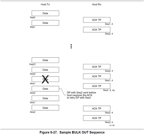 ACK(CStream, NumP=0, PP=1, Rty) –如果设备接收到Rty = 1而NumP = 0的ACK TP,则应该转换进入INMvData Burst End状态,并等待主机发起下一个突发(initiate the next burst)。这是主机在检测到从设备来的DP中有错误,但突发已经完成(burst was complete)时的主机响应。主机应该在下一个突发中继续重试过程(continue the retry process in the next burst)。