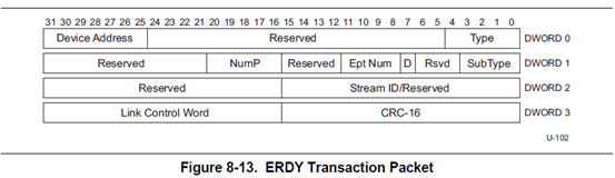 DPH(Deferred) – 如果接收到Deferred (DF)标志被设置的DPH,则则设备应该将管道转换进入Deferred Prime Pipe状态。当在等待主机响应Start Stream请求,链路被转换进入U1或U2状态时,会接收到这个包。注意这一转换只有在tERDYTimeout被超过时才会发生,因此是极不易(highly unlikely)发生的。在这种情形下,设备被期望用ERDY来重试。没有与deferred DPH相关联的DPP。