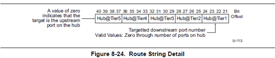 如果Type字段的值是Transaction Packet 或者Data Packet Header,那么Route String和Device Address字段将依照Type字段而定。Route String字段被集线器用于路由在其上行端口出现的数据包到适当的下行端口。从设备来的数据包总是从集线器的下行端口路由到其上行端口。Device Address字段用来供主机识别一个数据包的源。所有其它的字段将在本章后面得以详述。