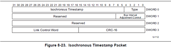 • 等时时戳包【Isochronous Timestamp Packets (ITP)】是在主机到一个或多个设备间的所有活动链路(active links)上的多播(multicast)。