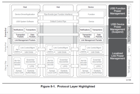 端点只响应由主机作出的请求。主机负责调度总线上的事务,并维护总线上数据搬移的优先级和公平性(priority and fairness);这是通过对IN和OUT请求进行计时和排序(timing and ordering)达到的。事务不是广播;包通过一条直接的路径在主机和设备间穿越(traverse a direct path)。任何没有被使用的链路都可以被设置到低功耗状态(reduced power states),使得总线可以满足严苛的电源管理要求(amenable to aggressive power management)。