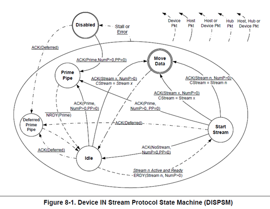 在下文中,假设Device IN Stream状态转换发生在设备发送与状态机相关的消息的第一个符号的第一个比特给主机时,或者当设备首次解码从主机来的状态机相关的消息时。对于IN管道,主机端的Endpoint Buffers接收来自设备的Function Data。