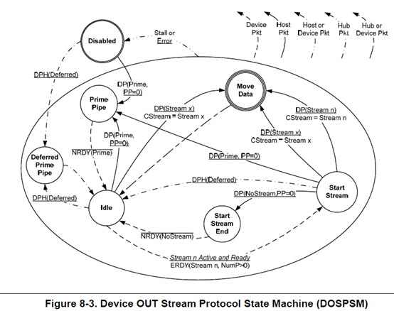 【勘误:上图中,从Idle状态到Start Stream End状态之间,应该添加一条弧线(arc),标签为DP(NoStream,PP=0)。在转换进入U0后,设备会立即发送一个ERDY,导致DOSPSM和HOSPSM从Idle状态转换进入Start Stream状态。在转换进入Start Stream状态之后,设备从一个集线器处接收到一个DPH(Deferred),导致DOSPSM转换到Idle状态。在这一刻,DOSPSM和HOSPSM变得不同步(out of sync)。HOSPSM正处于Start Stream状态,就发送一个DP(NoStream, PP=0);然而设备正处于Idle,从而不能处理这个包。】