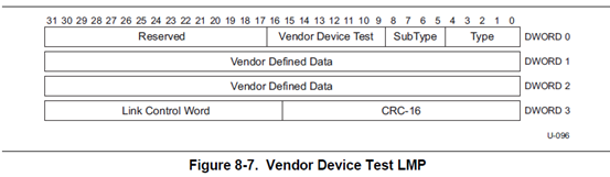 Subtype. 这个字段应该被设置为0011b用于Vendor Device Test LMP. |