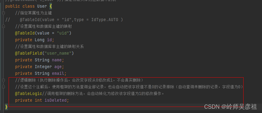 给实体特定某个属性添加这个注解后,使用框架提供的删除方法,会默认变成修改该字段值为1的修改操作,且提供的所有查询方法,也会默认查询未被删除过的记录(该字段值为0)