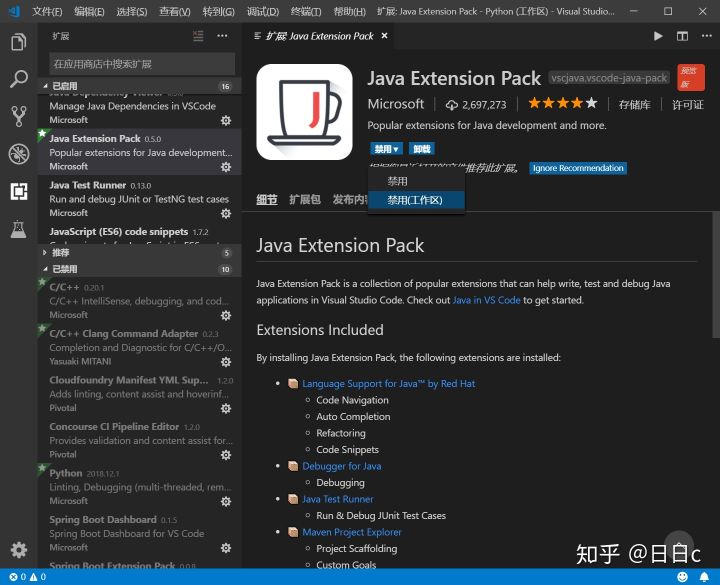 禁用后会发现此扩展包下的所有Java插件集合都被禁用。