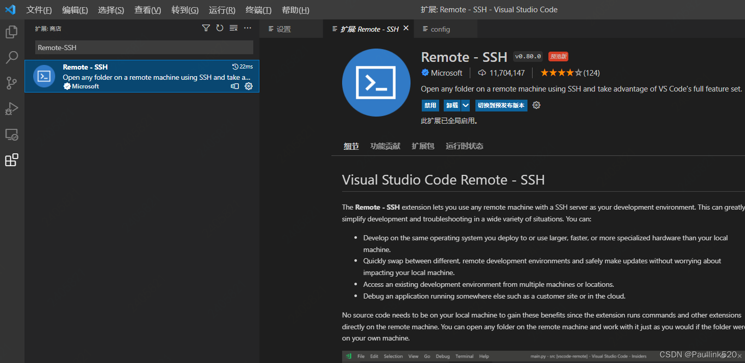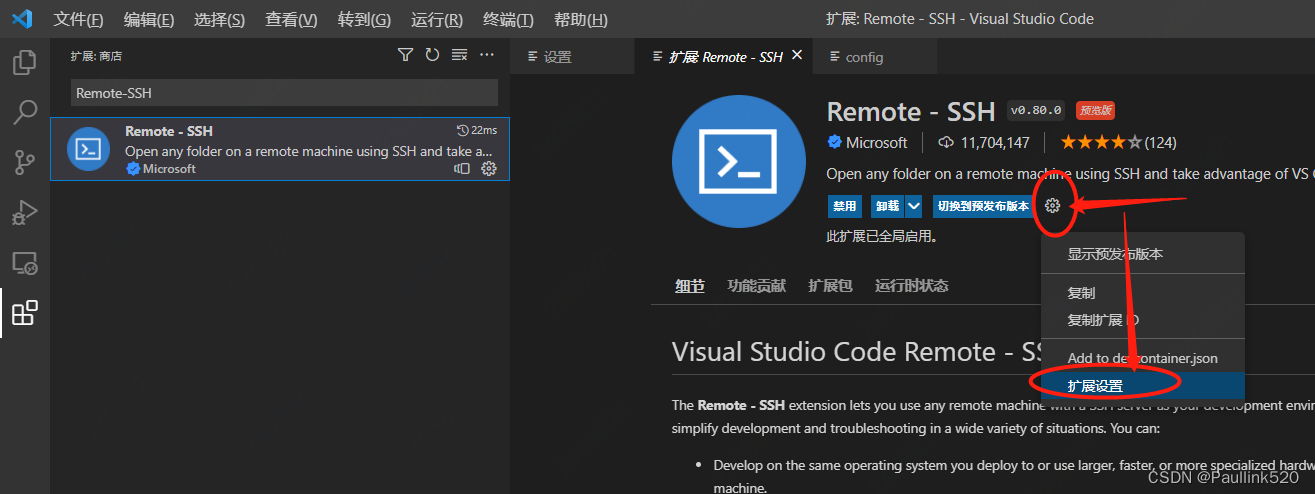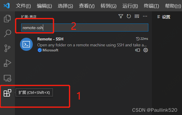 3.1 打开vscode,在【扩展】中,输入【Remote-SSH】进行搜索