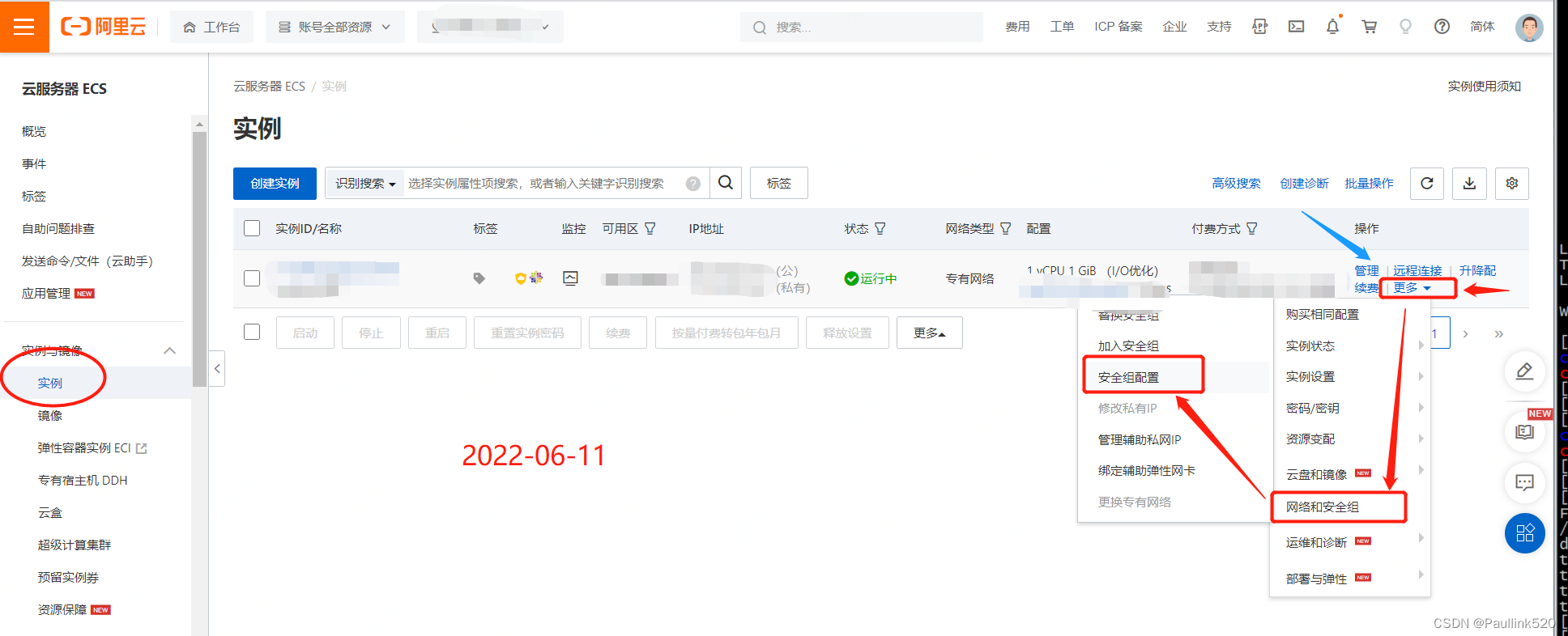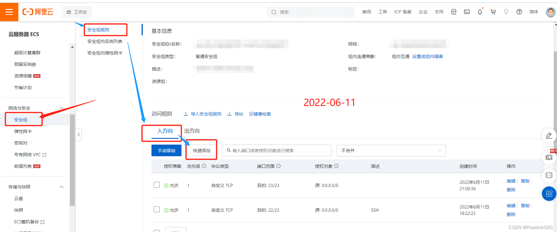 访问路径:【实例】最右侧→【更多】→【网络和安全组】→【安全组配置】