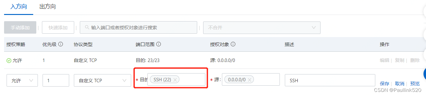 2.5 添加端口配置,选择【SSH(22)】,其他项不需要更改,点击【确认】