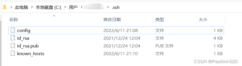 step2:在你的电脑(这里为PC机示例哈),进入该配置文件目录:C:\Users\xxx(你的用户名)\.ssh ,可以看到这些配置文件。暂且关注着就好