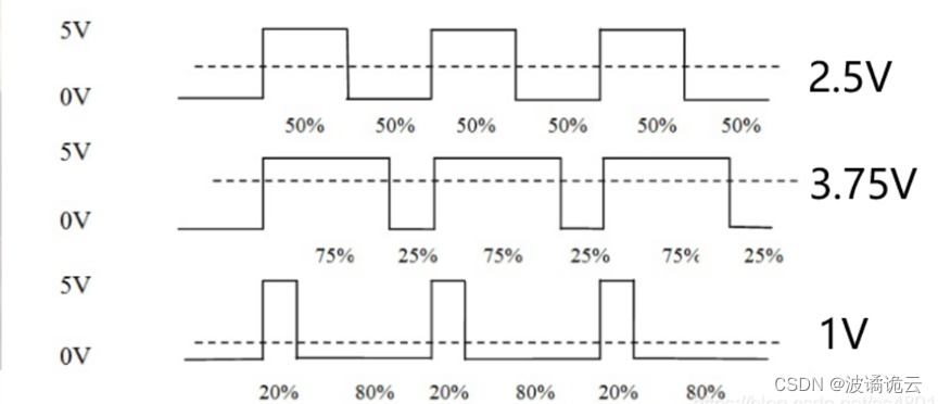 脉冲宽度调制(Pulse Width Modulation,PWM),指按照一定的规律改变脉冲序列的脉冲宽度(占空比值),调节输出量和波形的一种调制方式,常用来输出矩形 PWM 信号。要输出不同的模拟电压,就要用到PWM,通过改变IO口输出的方波的占空比从而获得使用数字信号模拟成的模拟电压信号。电压是以一种连接1或断开0的重复脉冲序列被夹到模拟负载上去的,连接即是直流供电输出,断开即是直流供电断开。通过对连接和断开时间的控制,理论上来讲,可以输出任意不大于最大电压值的模拟电压。