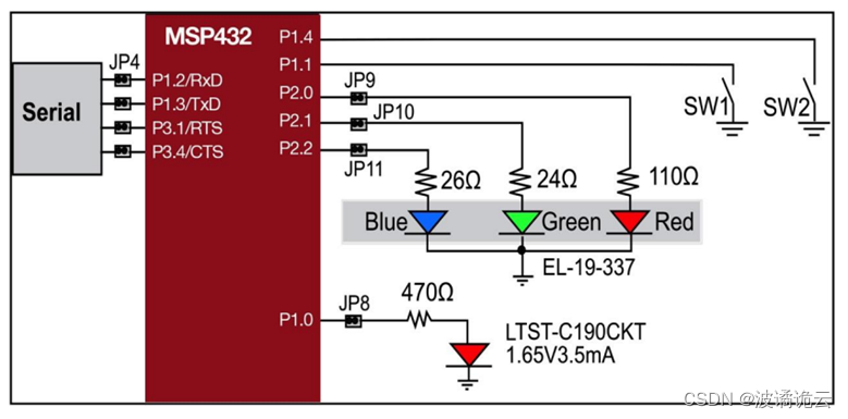 开关 SW1、SW2 分别连接到 CPU 的 P1.1、P1.4 的两个 GPIO 口,四个发光二级管的阳极连接到 CPU 的 P2.0、P2.1、P2.2、P1.0 的四个 GPIO 口。SW1和 SW2 的状态可以作为输入信号,控制 LED 灯的颜色和闪烁。