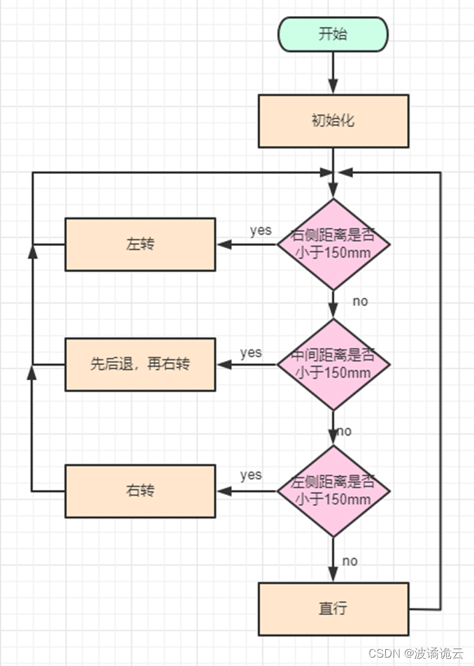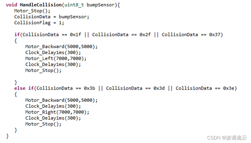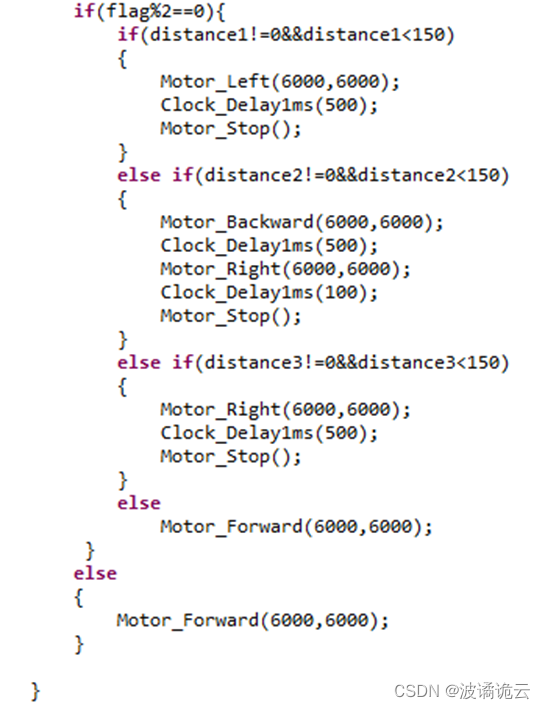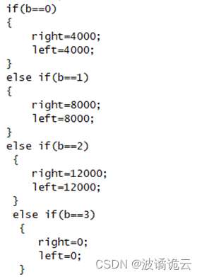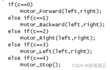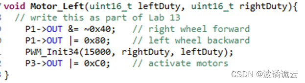 改变小车的运动状态,我们调用不同运动函数来改变小车的状态,以左转函数为例:Motor_Left(uint16_t leftDuty, uint16_t rightDuty),其中参数 leftDuty 和 rightDuty 分别改变左轮和右轮的占空比,从而实现对电机速度的控制,数值越大,电机运动速度越快。左轮后退,右轮前进,可实现左转功能,左轮前进,右轮后退,可实现右转功能。