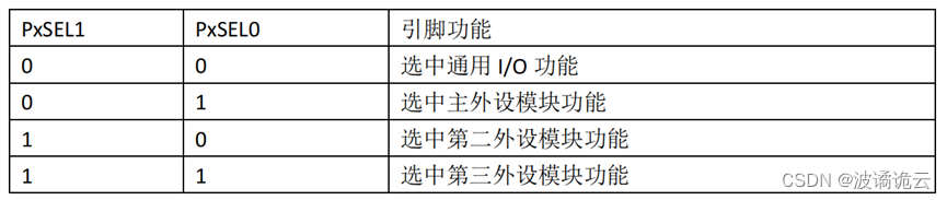 每个端口的引脚可使用两个位来选择引脚功能:I/O 功能或 3 个可能的外设模块功能中的一个。