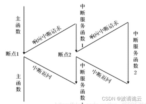 中断嵌套:在中断服务过程中执行更高级别的中断服务。