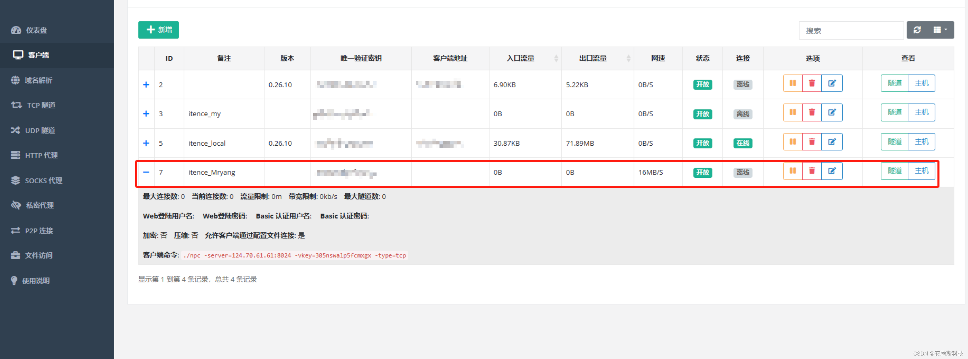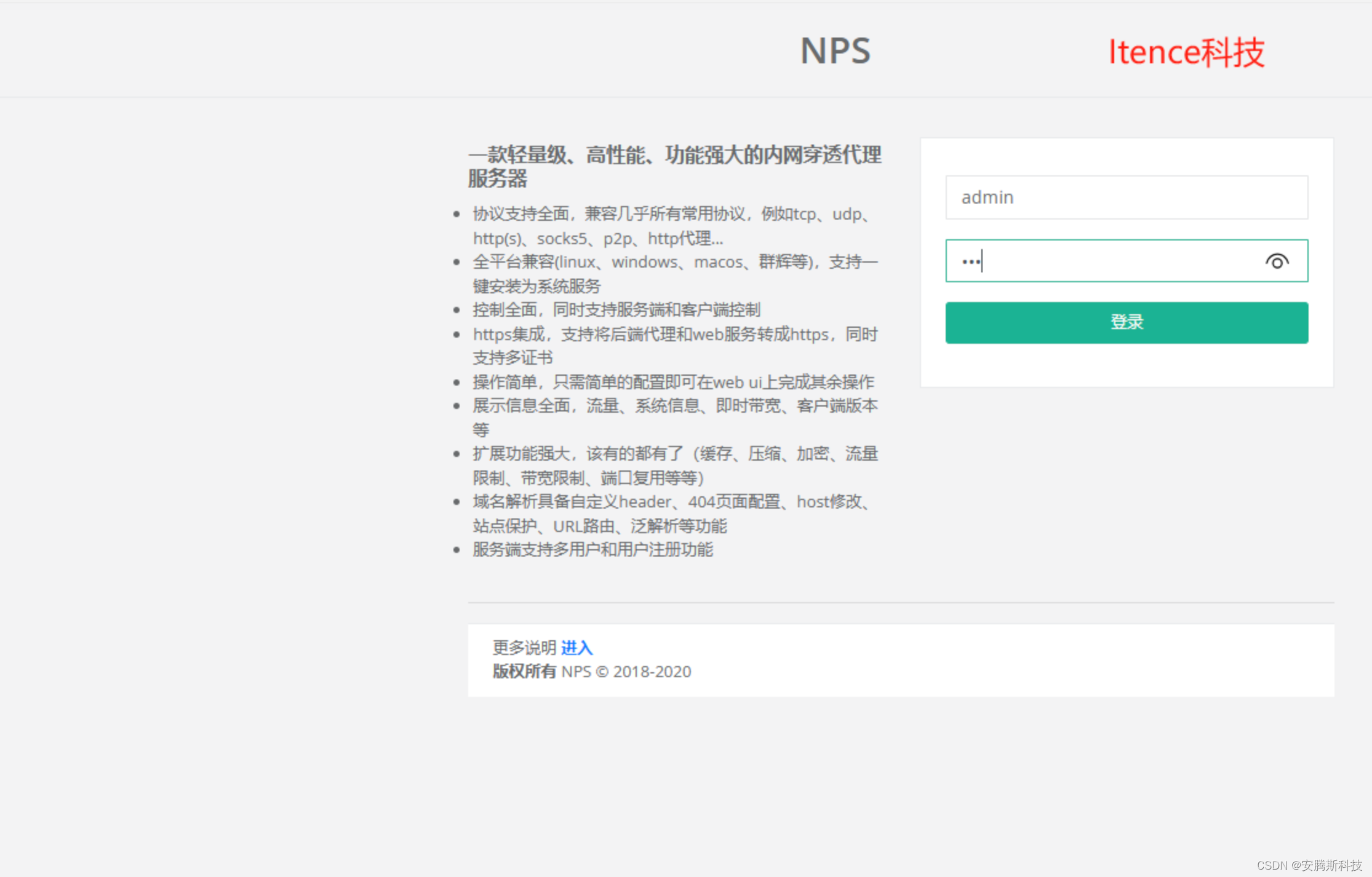 NPS是一款轻量级、高性能、功能强大的内网穿透代理服务器。目前支持tcp、udp流量转发,可支持任何tcp、udp上层协议,此外还支持内网http代理、内网socks5代理、p2p等,并带有功能强大的web管理端。