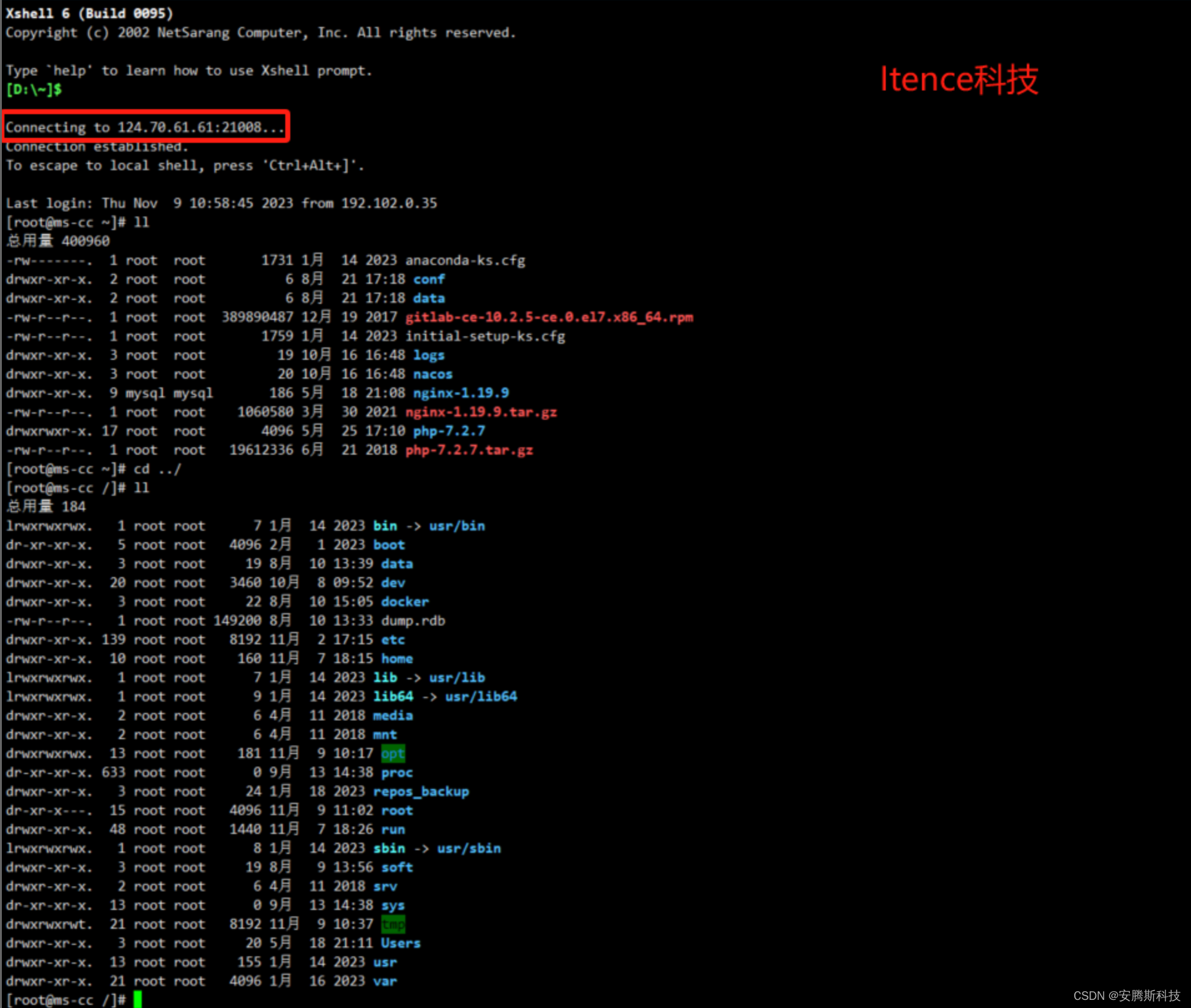 即可连接成功,我们用服务器的21008代理本地服务器的22端口,以便我们能在xshell中可以访问服务器资源